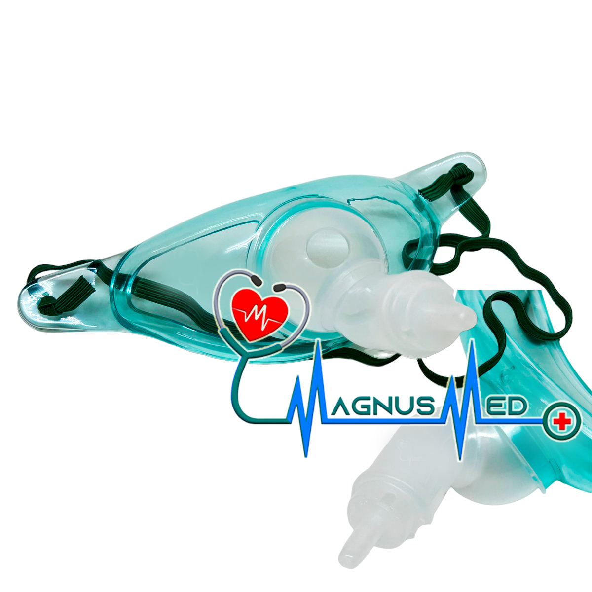 Máscara para nebulização de traqueostomia com conector giratório em polietileno e o conector da máscara em polipropileno e fixador em faixa elástica.