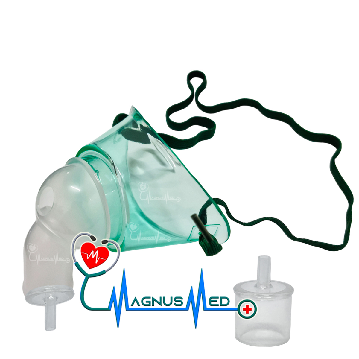 Máscara para nebulização de traqueostomia com conector giratório em polietileno e o conector da máscara em polipropileno e fixador em faixa elástica.